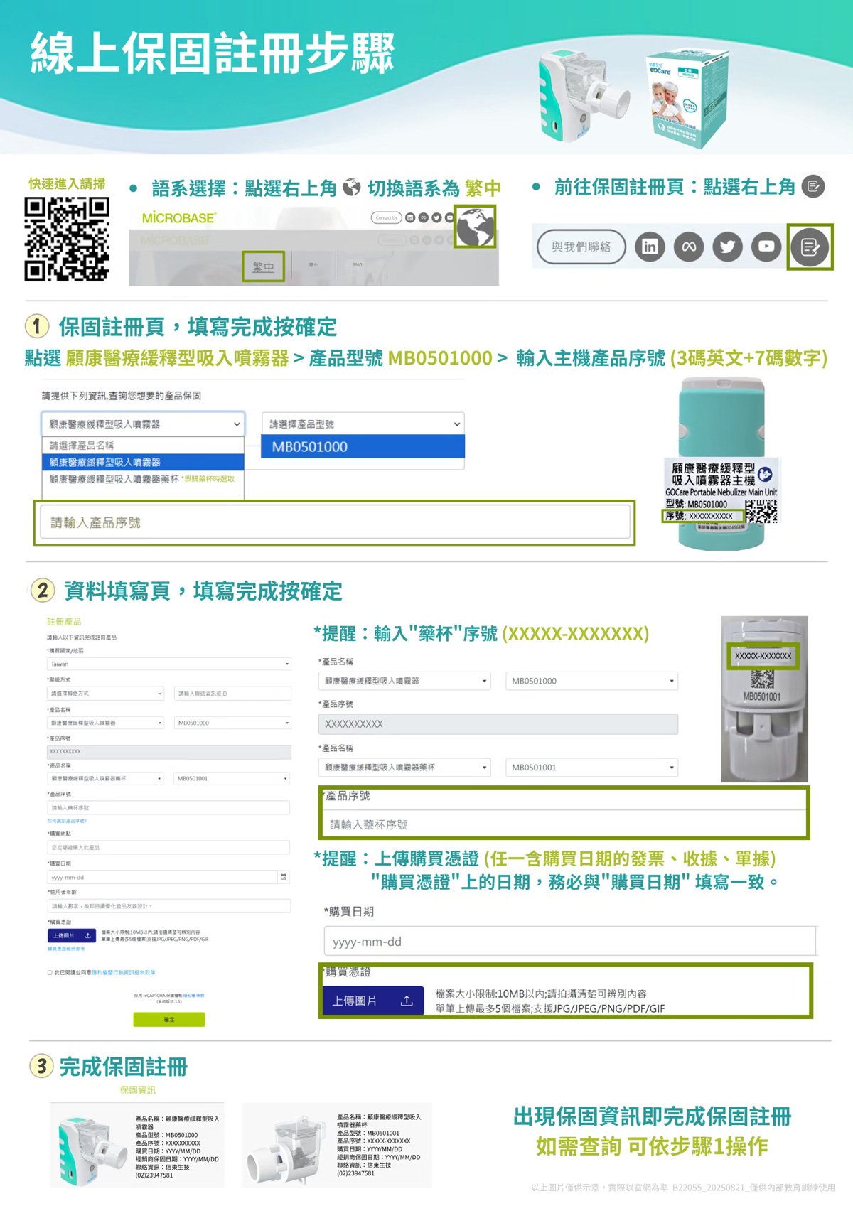 保固登錄:https://www.microbasetech.com/support(型號:主機MB05010、藥杯MB0501001);